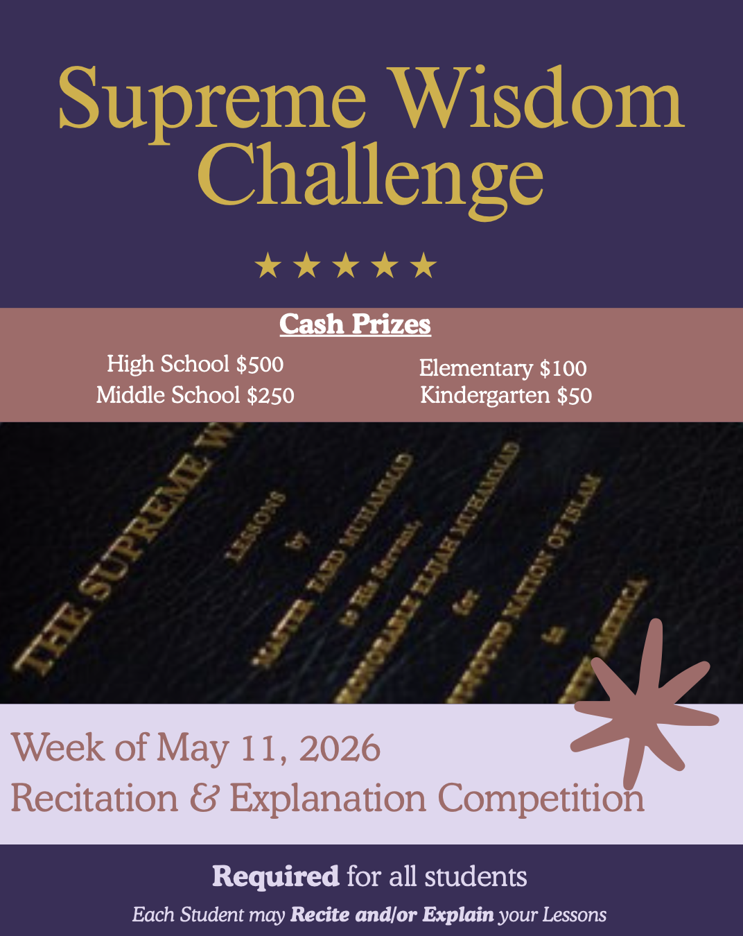 Each student will recite, word for word, the lessons from the Supreme Wisdom. At every competition level, students will be ranked based on who recited the largest portion of the Supreme Wisdom with the least errors. All students will recite the Supreme Wisdom in the following order: